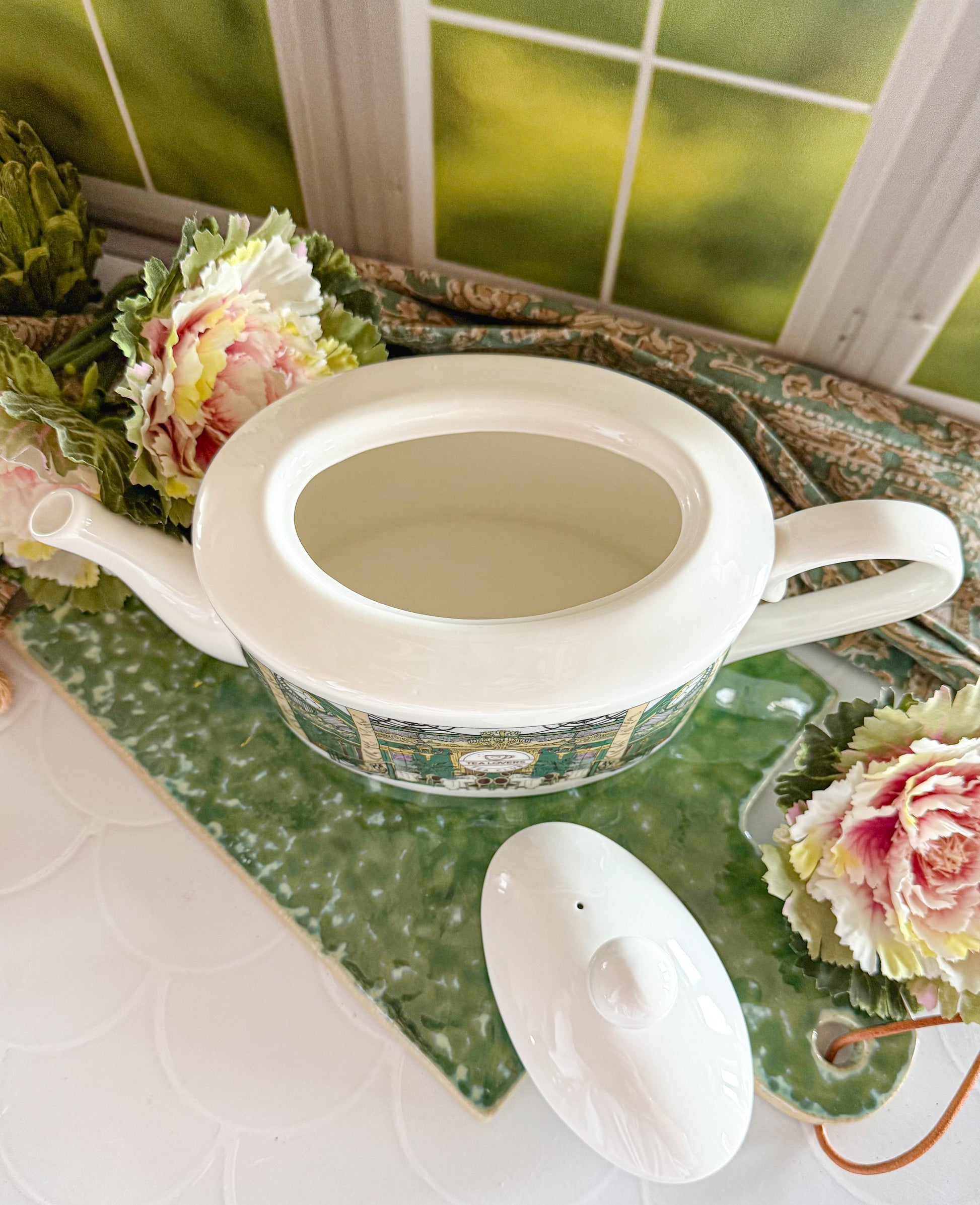 6 Cup Oval Teapot Expertly crafted from fine bone china, this beautiful 6-cup teapot is characterized by its effortless pouring design. Paying homage to the Art Deco era and the revered tradition of afternoon tea at Claridges hotel, London, it features delicate hand-drawn illustrations. These illustrations are then lithographed and meticulously applied by hand, before undergoing a firing process at over 700 degrees, guaranteeing a long-lasting finish. This labor-intensive process ensures that the teapot will remain an exquisite and refined presence for years to come.