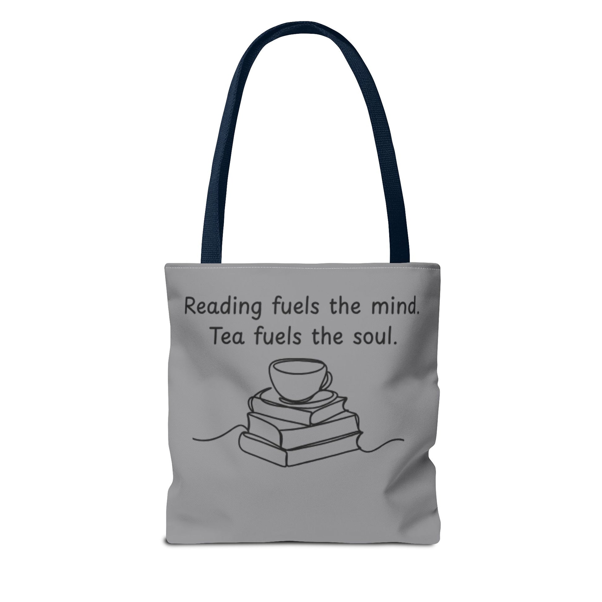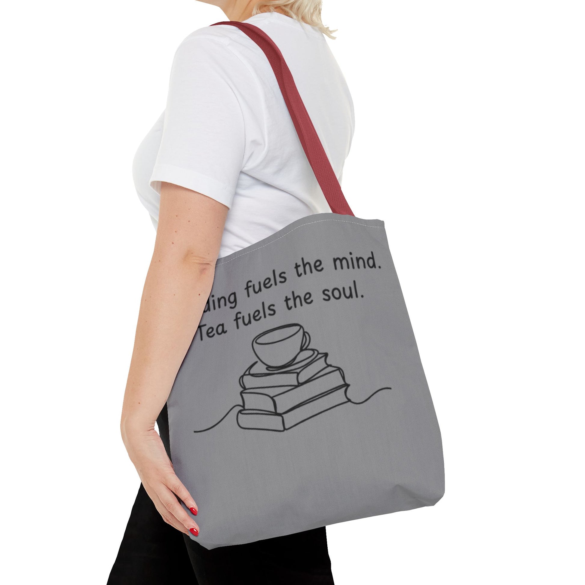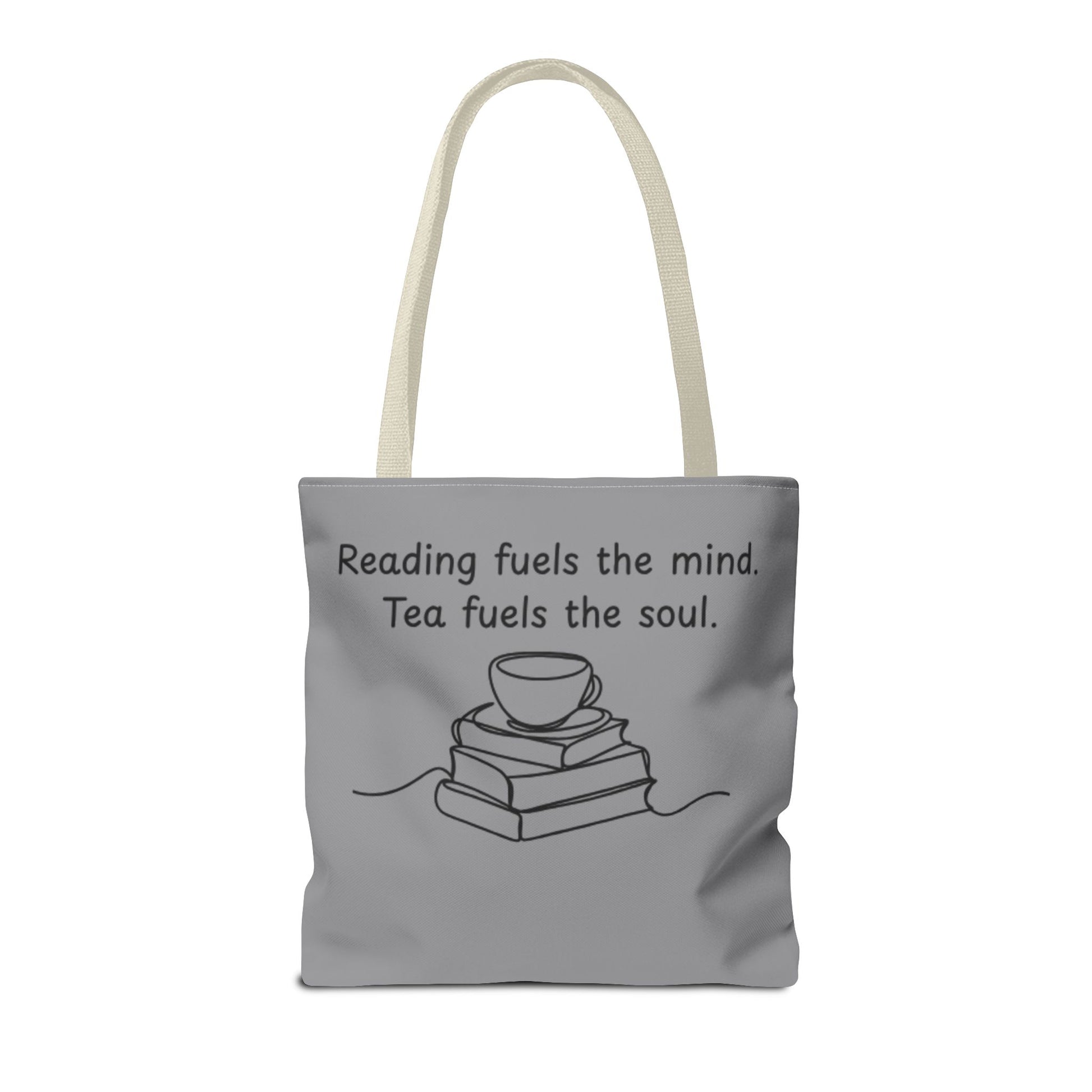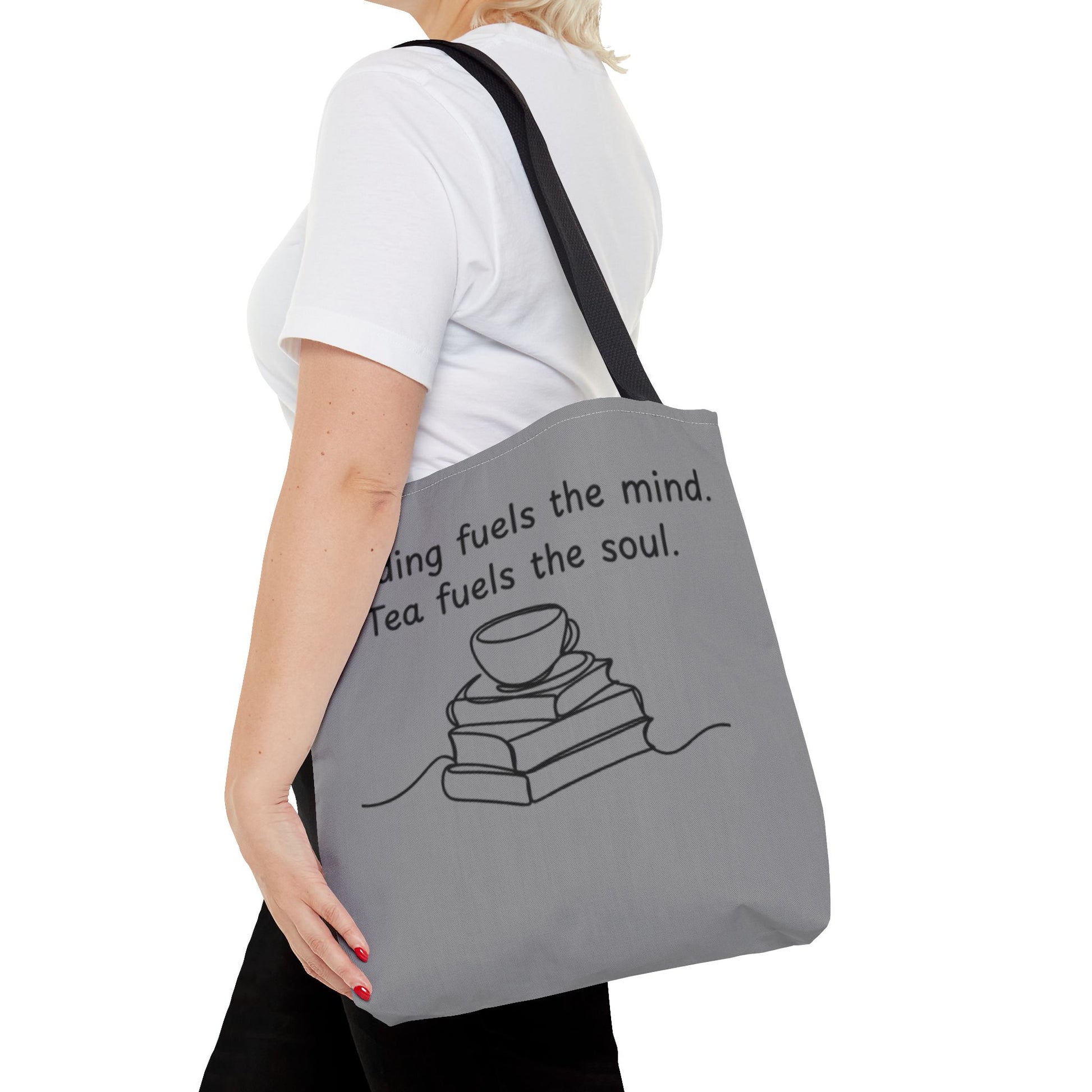 Introducing a charming Tote Bag, perfect for book lovers and tea enthusiasts. Featuring a delightful design that reads, 'Reading fuels the mind. Tea fuels the soul,' this bag radiates warmth and inspiration. Its stylish yet functional design makes it an ideal companion for trips to the library, cozy coffee shop outings, or casual day-to-day errands. The Tote Bag offers a cozy vibe that appeals to anyone who appreciates a good book and a warm cup of tea. It's a thoughtful gift for holidays, birthdays, and special occasions, or simply to spoil yourself on a self-care day. Embrace a love of reading and celebrate your passion with this versatile accessory.