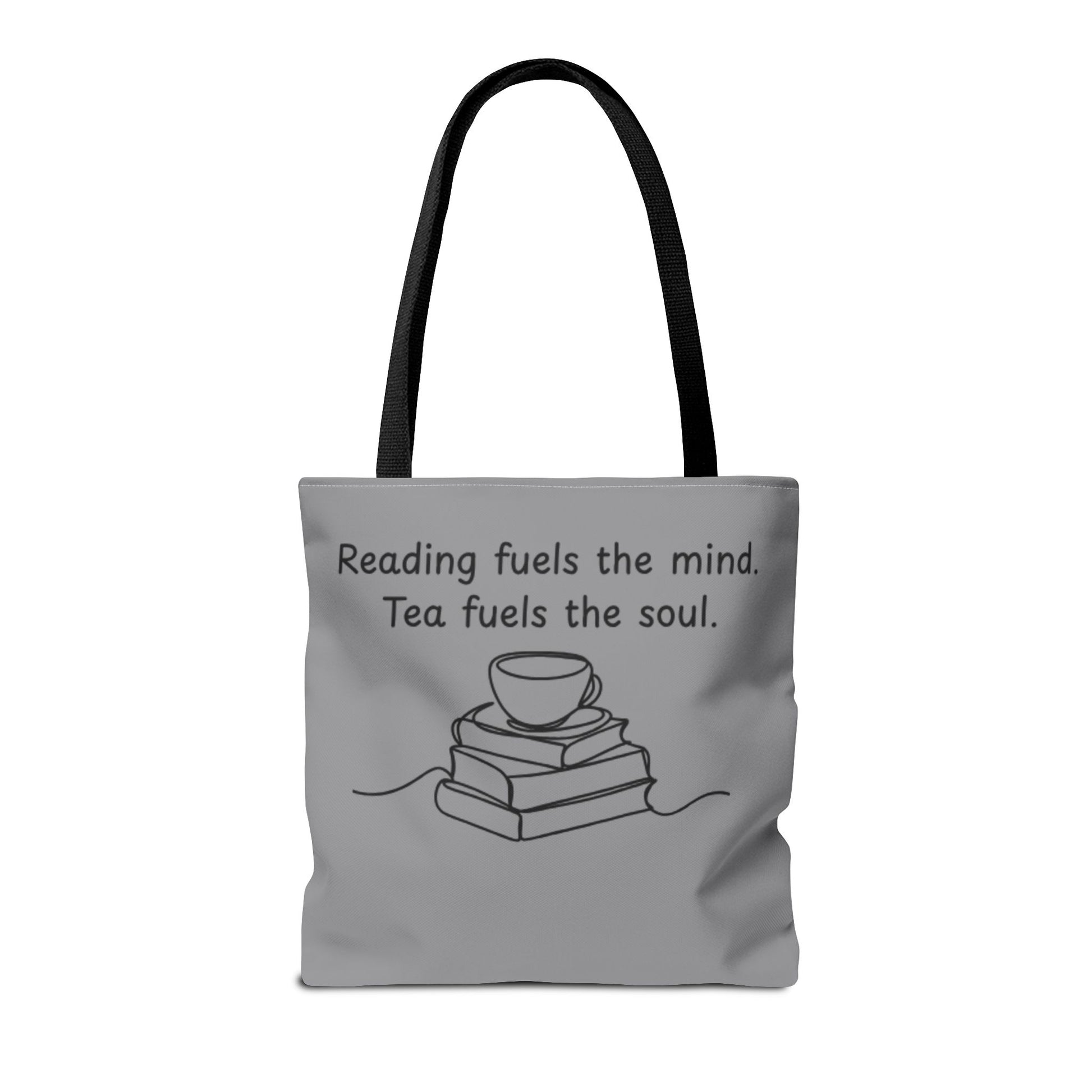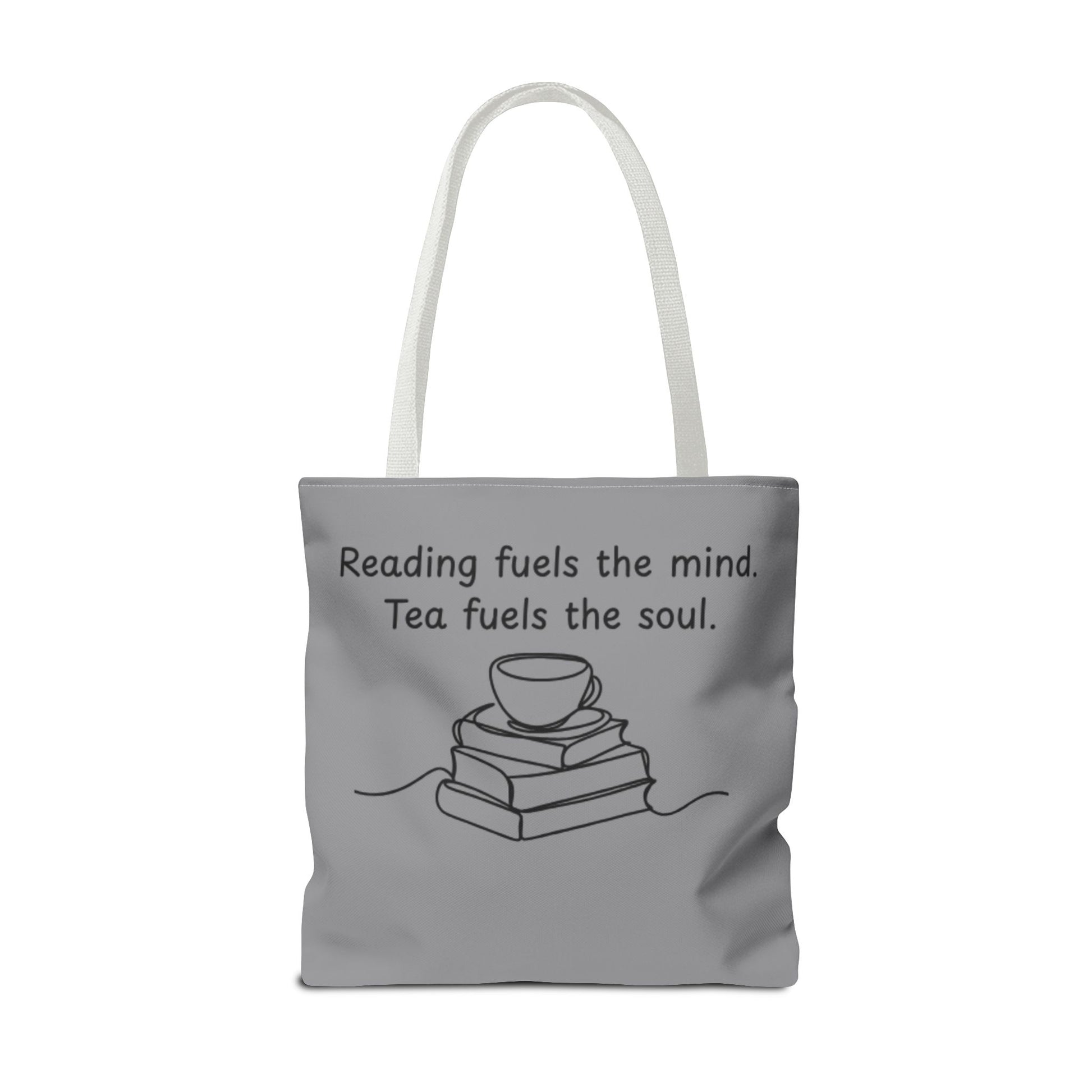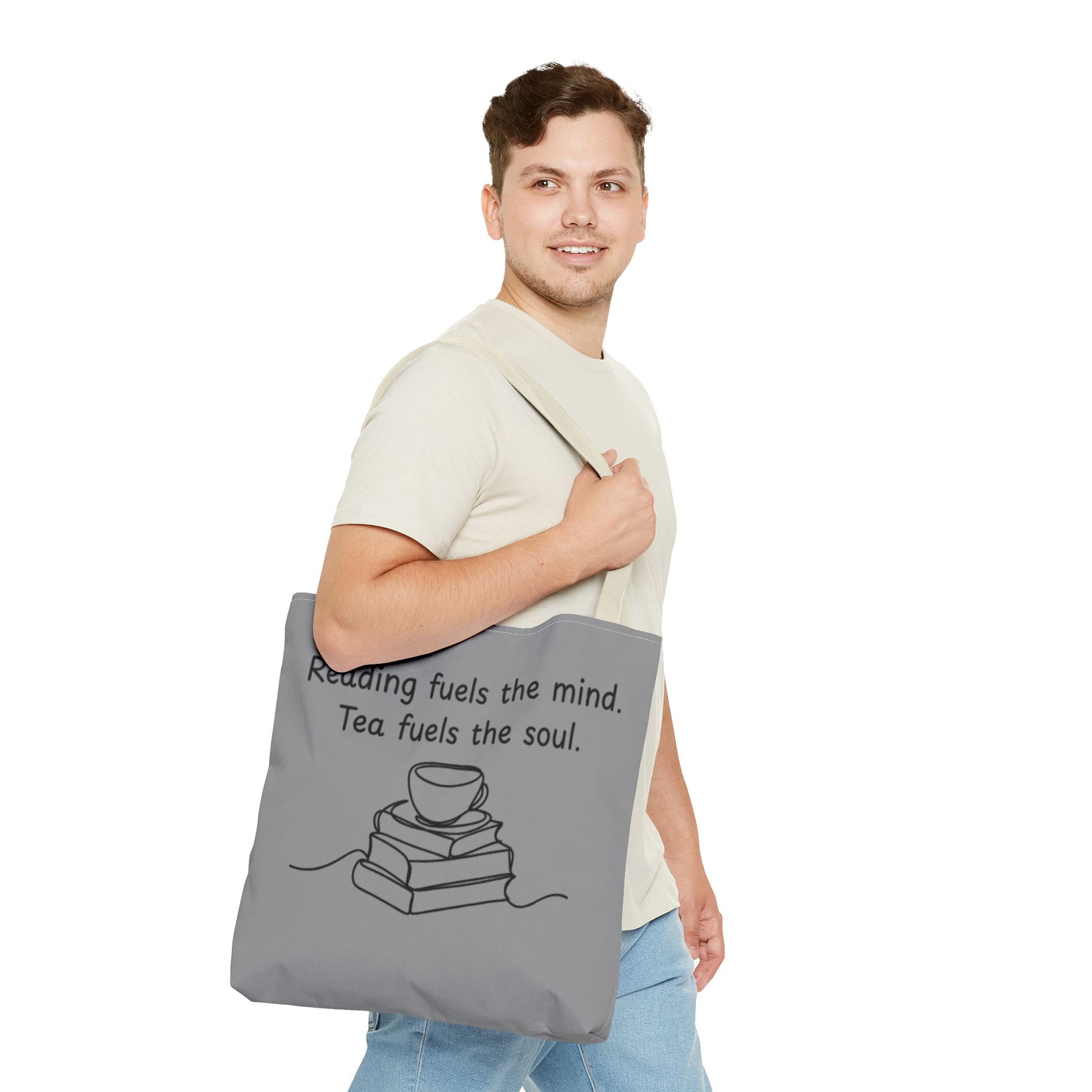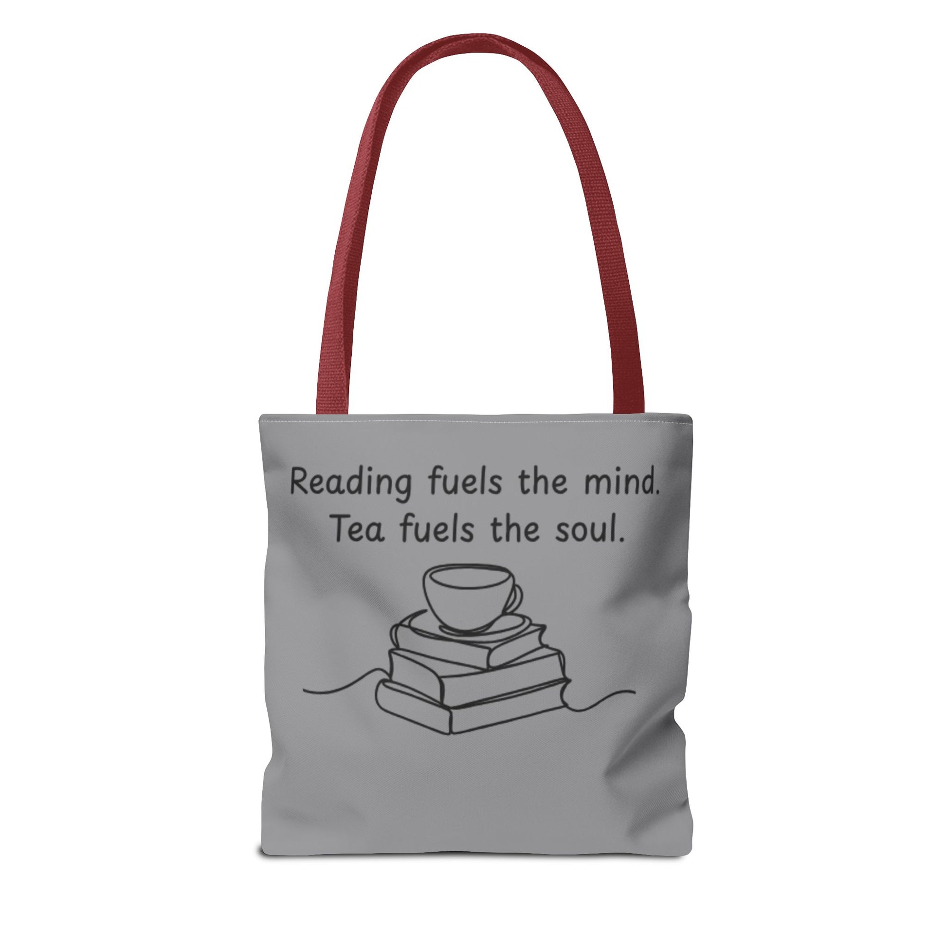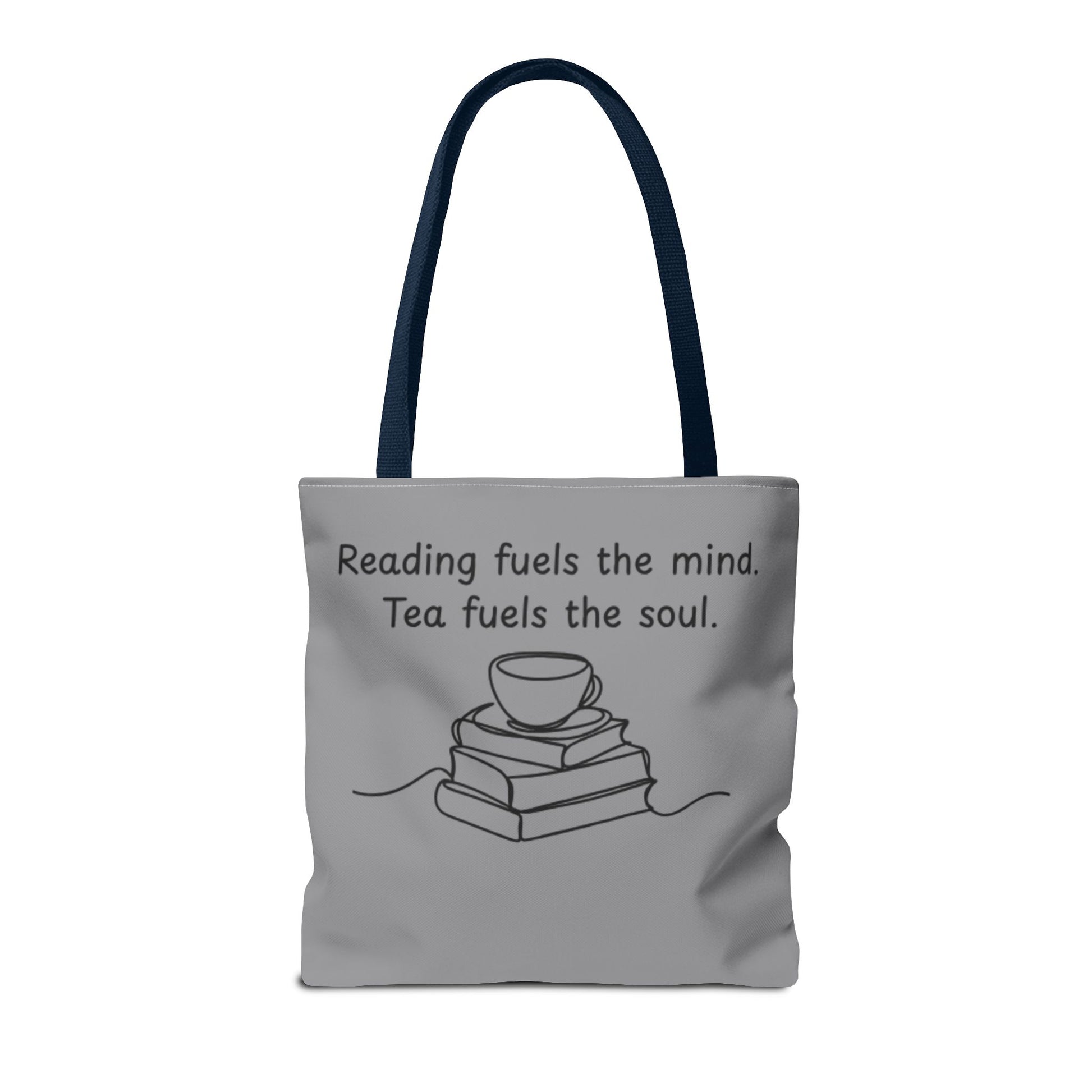 Introducing a charming Tote Bag, perfect for book lovers and tea enthusiasts. Featuring a delightful design that reads, 'Reading fuels the mind. Tea fuels the soul,' this bag radiates warmth and inspiration. Its stylish yet functional design makes it an ideal companion for trips to the library, cozy coffee shop outings, or casual day-to-day errands. The Tote Bag offers a cozy vibe that appeals to anyone who appreciates a good book and a warm cup of tea. It's a thoughtful gift for holidays, birthdays, and special occasions, or simply to spoil yourself on a self-care day. Embrace a love of reading and celebrate your passion with this versatile accessory.