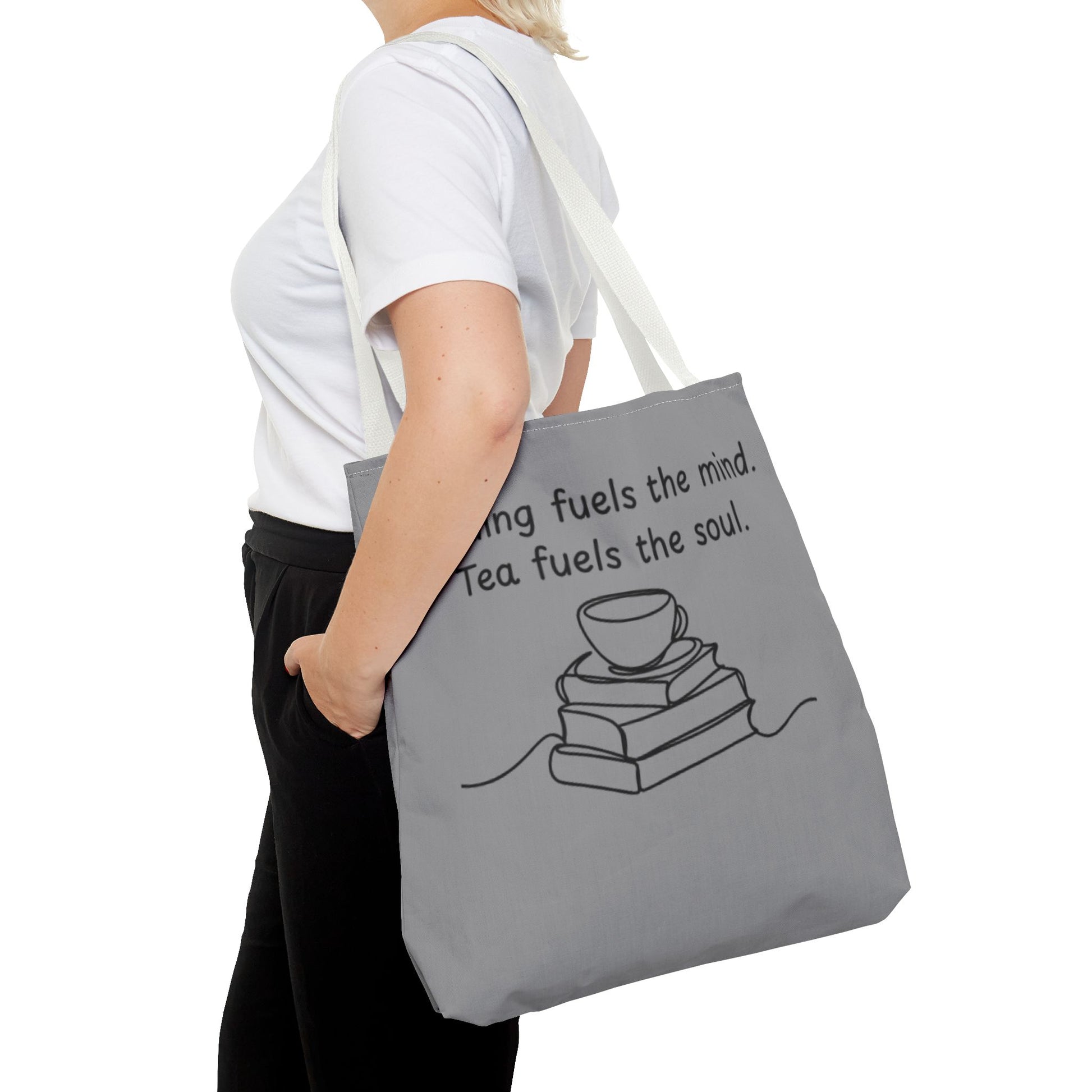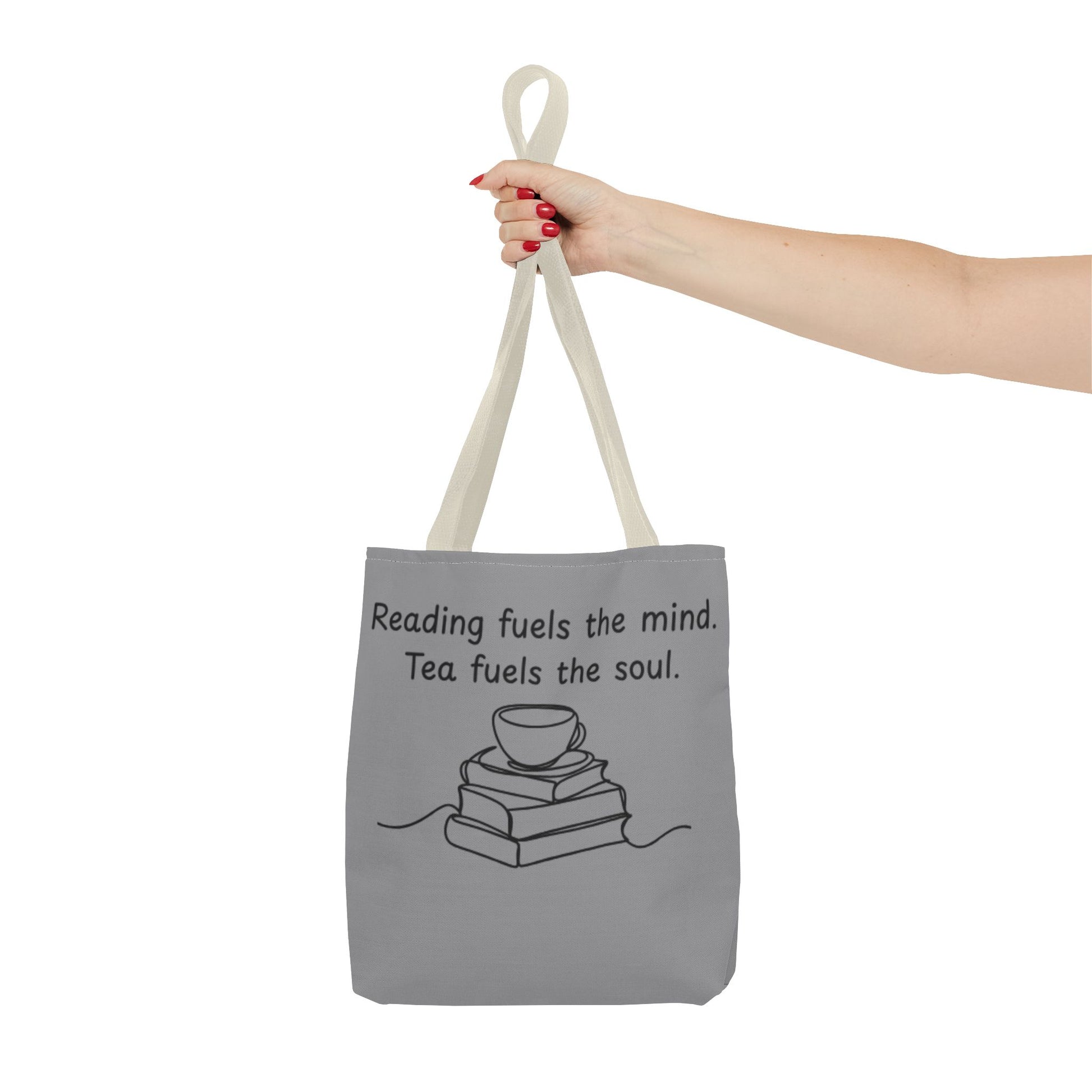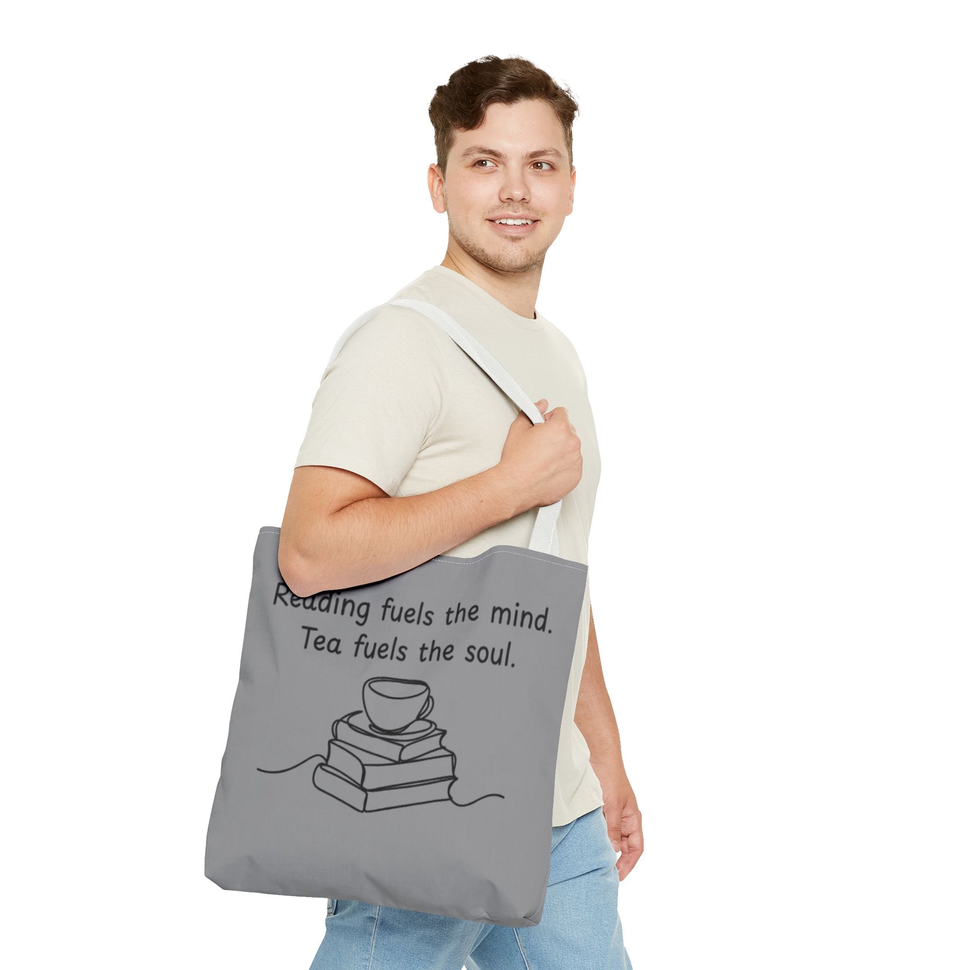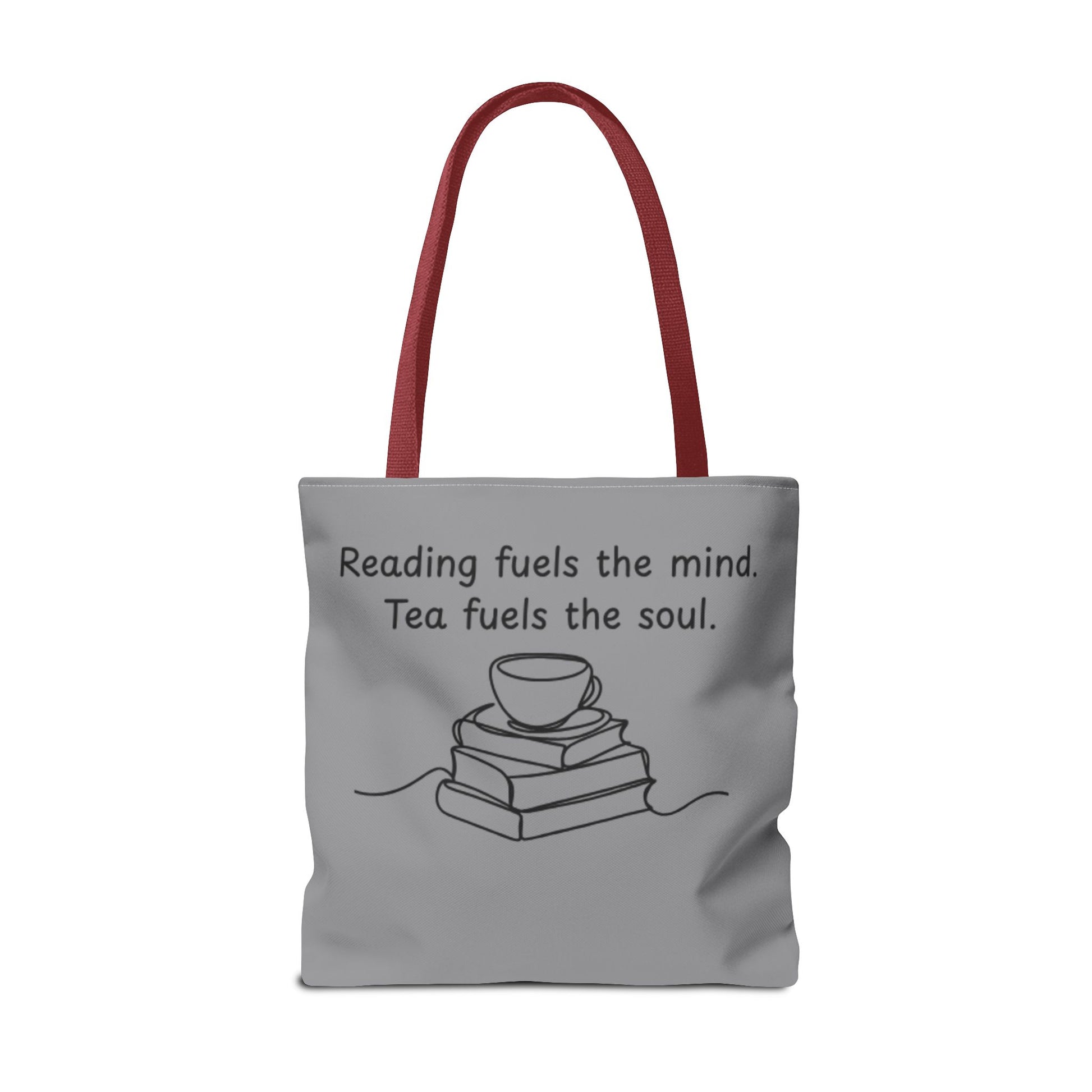Introducing a charming Tote Bag, perfect for book lovers and tea enthusiasts. Featuring a delightful design that reads, 'Reading fuels the mind. Tea fuels the soul,' this bag radiates warmth and inspiration. Its stylish yet functional design makes it an ideal companion for trips to the library, cozy coffee shop outings, or casual day-to-day errands. The Tote Bag offers a cozy vibe that appeals to anyone who appreciates a good book and a warm cup of tea. It's a thoughtful gift for holidays, birthdays, and special occasions, or simply to spoil yourself on a self-care day. Embrace a love of reading and celebrate your passion with this versatile accessory.