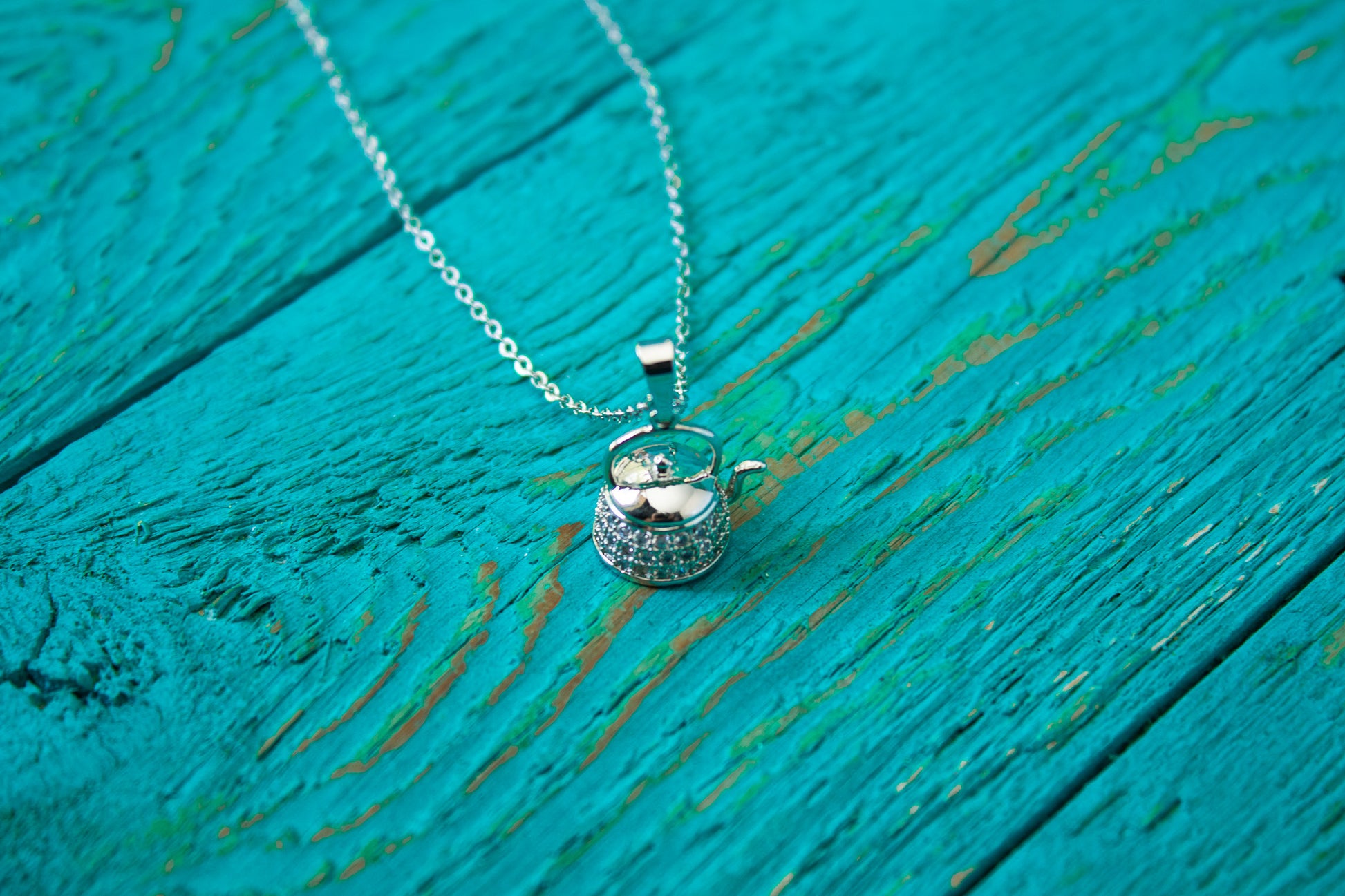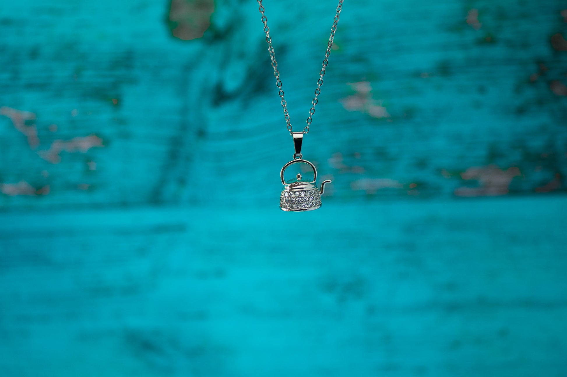 Stainless Steel & Cubic Zirconia Teapot Necklace – Silver Finish