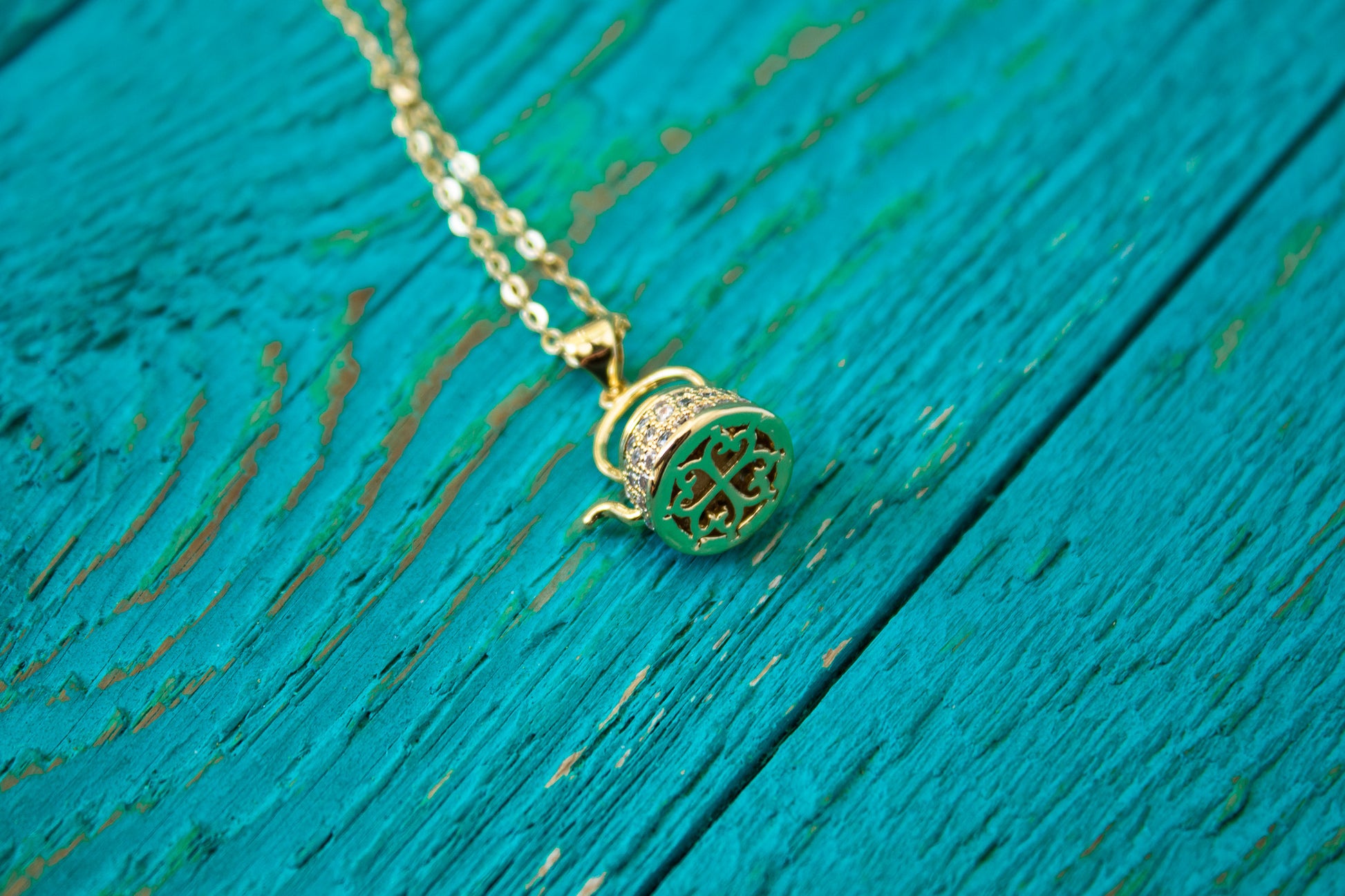 Stainless Steel & Cubic Zirconia Teapot Necklace – Gold Finish